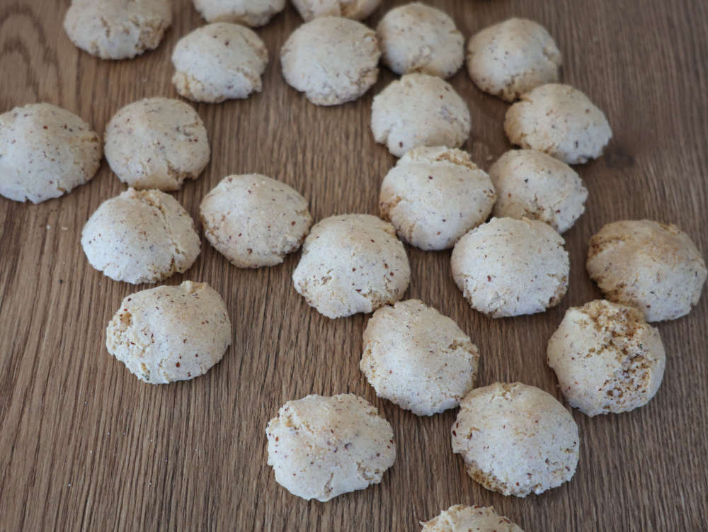 - Aus dem Teig kleine Kugeln von 1 cm Durchmesser formen. (Bei mir wog eine Kugel 7 g)