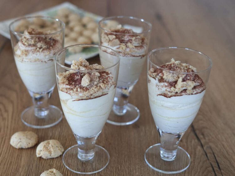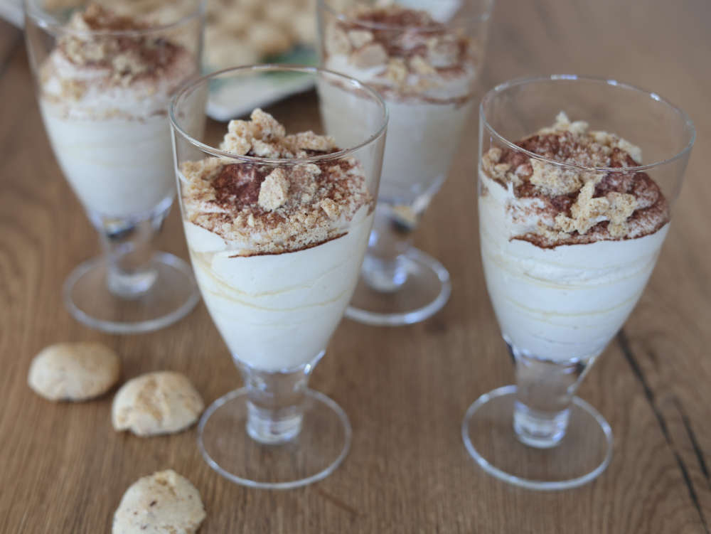 Die fertige Creme mindestens 1–2 Stunden im Kühlschrank durchziehen lassen. Vor dem Servieren mit Kakaopulver bestäuben oder mit einem einzelnen Amaretti garnieren.