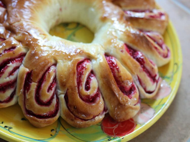 Heute habe ich eine Himbeer-Babka gebacken. Anstelle der klassischen Flechttechnik habe ich den Teig zunächst zu einer Rolle geformt, diese zu einem Ring geschlossen und den Ring anschließend in regelmäßigen Abständen eingeschnitten. So entstand die besondere Form dieser Babka.