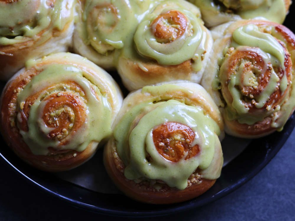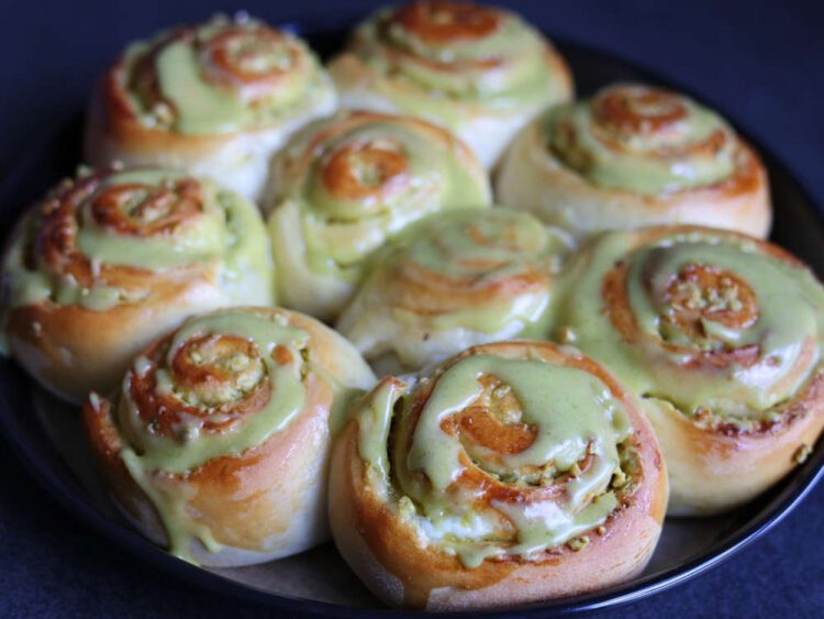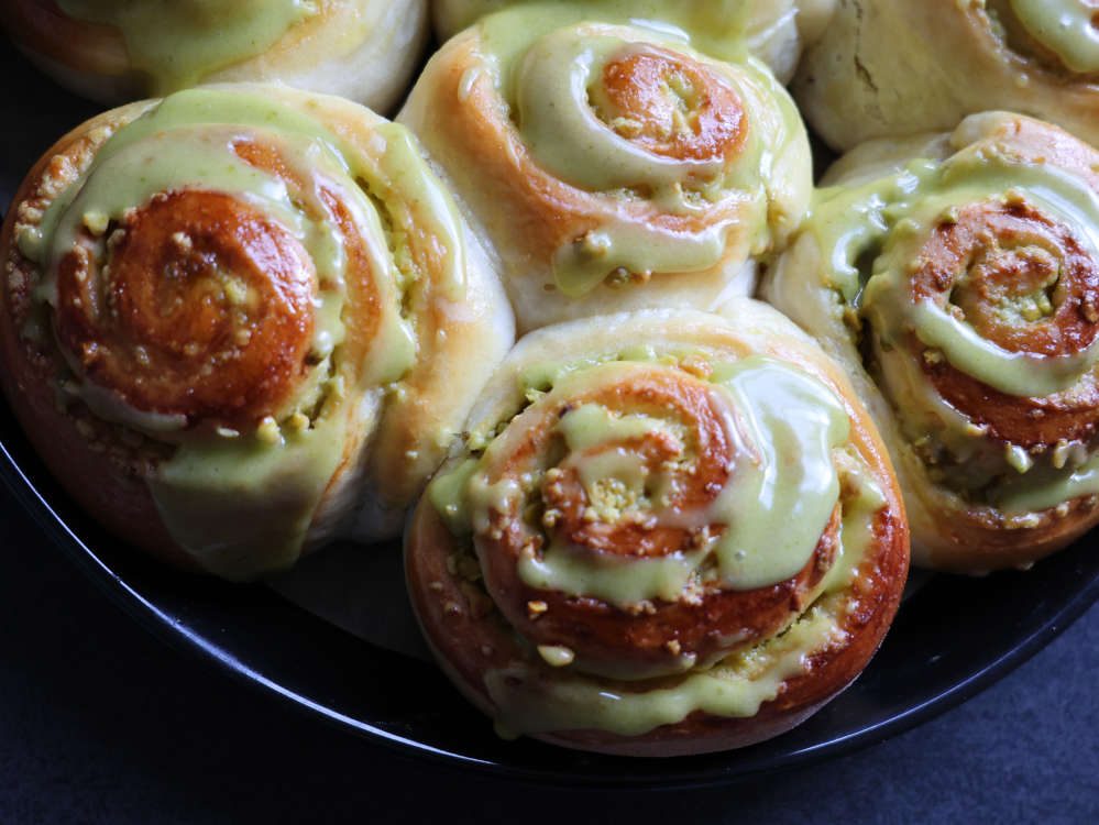 Nach dem Ausrollen des Teiges wird die Pistazienmasse gleichmäßig darauf verteilt und mit gehackten Pistazien bestreut. Anschließend wird der Teig zu einer Rolle aufgerollt und in gleichmäßige Stücke geschnitten. Diese kommen in eine runde Backform. Nach dem Backen habe ich die Pistazien Schnecken mit einem Pistazien Zuckerguss versehen.